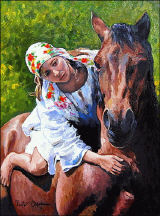 Sie mußte sehr selbstbewußt sein, dieses Mädchen vom Lande. Barfuß und ohne Sattel vermochte sie sich auf dem Rücken ihres Pferdes zu halten. Liebevoll streichelte sie die Brust des Pferdes, ein beruhigende oder aufmunternde Geste der hübschen Reiterin. Wie würde ihr buntes Kopftuch im Winde flattern, wenn die beiden erst einmal losgaloppiert wären?