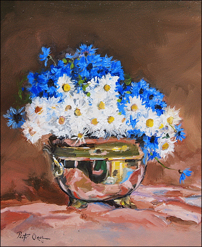 Hier finden sich in einer Messingschale zwei der Schönsten aller Blumen der Landstraßen, Wege und Felder. Den Wandernden grüßen sie noch allerorten im Sommer und schenken ihm Frohmut für den weiteren Weg, die Adlige vom Lande, die tiefblaue Kornblume und die Landschönheit, die gelbweiße Margerite. Ihre schlichte und unverfälschte Schönheit läßt sie gegenüber der Flut von Zuchtblumen ob ihrer Einfachheit hervorleuchten ...