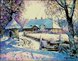 Rechts vorbei an der kleinen Kapelle führt der verschneite Weg bergan zum Gutsgebäude. Die zwei Schornsteine qualmen weiße Watte in den hellblauen Himmel und die vormittägliche Sonne taucht alles in einen rötlichen Schimmer. Bei solchem Wetter muß man den Schlitten auspacken und zum Rodeln gehen, oder mit einem guten Freund ...
