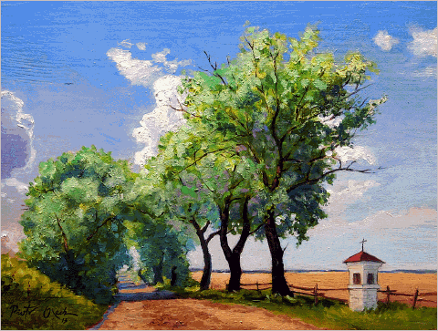 Flirrend unter mittäglicher Sonne zieht sich der rotbraune Landweg bis zum Horizont. Schweißperlen stehen auf der Stirn des einsamen Wanderes. Im Schatten der begleitenden Bäume wird es zwar kühler werden, doch der erfrischende Trunk aus einem Quell oder Bach bleibt ihm versagt. So weit sein Auge reicht, ist kein kühlender Trank in Sicht. Trotzdem wird er nur eine kurze Rast im Schatten einlegen können, denn zu qualvoll würde sonst das Weiterlaufen in der Hitze dieses Sommertages werden. Er hofft noch immer auf einen guten Platz mit Wasser und Feuerholz für die kommende Nacht, denn für heute ist der Weg zum nächsten Dorfe doch zu weit und beschwerlich. In den kommenden kühlen Morgenstunden des nächsten Tages wird er die verlorene Zeit bestimmt wieder aufholen können.
