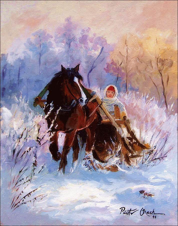 zum 1. Thema : Fahrt im Pferdeschlitten (SaM) / W drodze na targ wg. F.Rabski (2016)