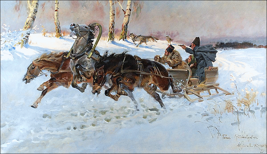 Bildmotiv : Angriffe von Wölfen > > > Winter — mit Pferdeschlitten — nach links fahrend