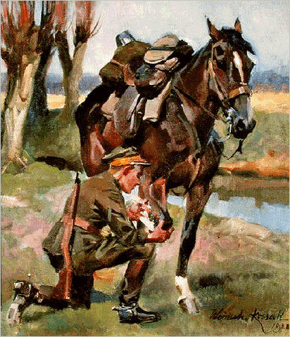 zu selbem Thema : Verband um die Fessel legen / Ułan opatrujący konia (1936)