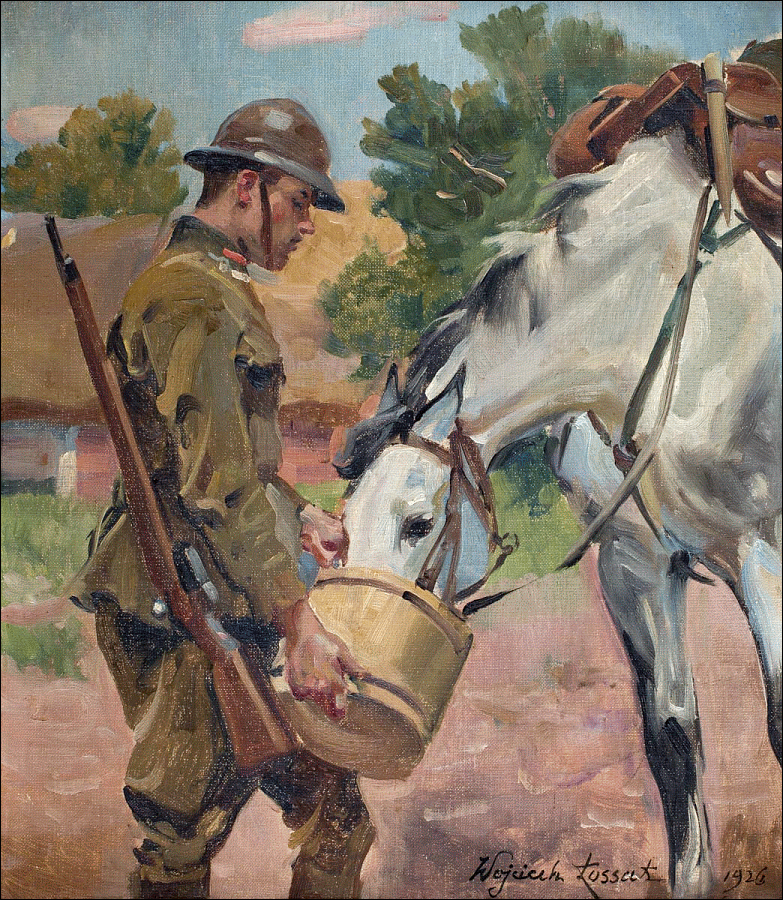 zu selbem Thema : Vor dem langen Ritt / Ułan pojący konia (1928)